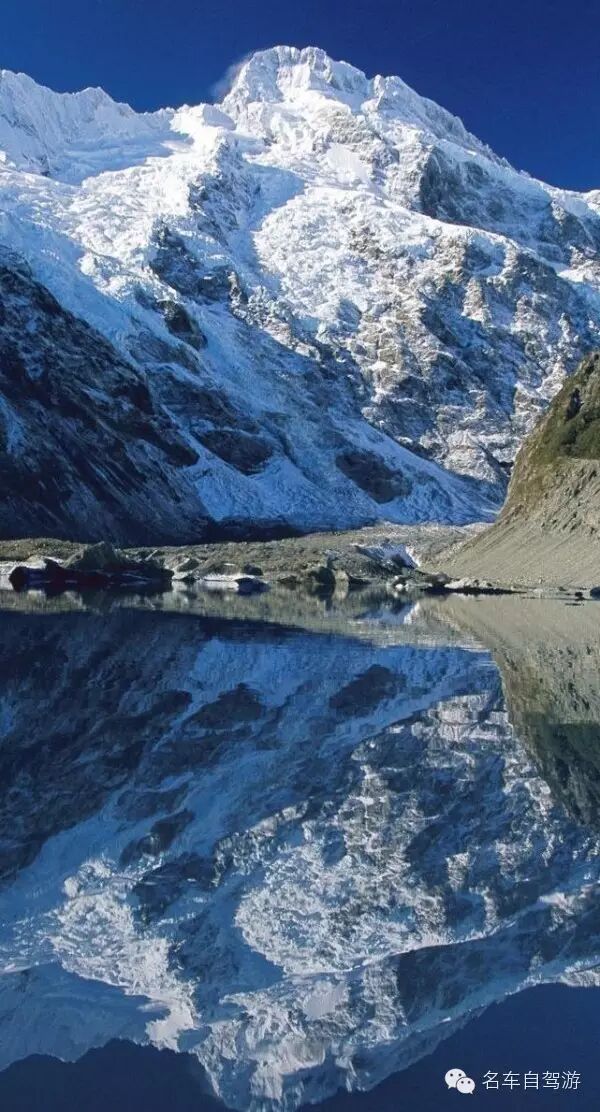 天晴时的湖面,明净得就如同一面银镜,将库克山和塔斯曼山的风景悉数倒映在湖面上,构成了一幅美丽的镜面油画。