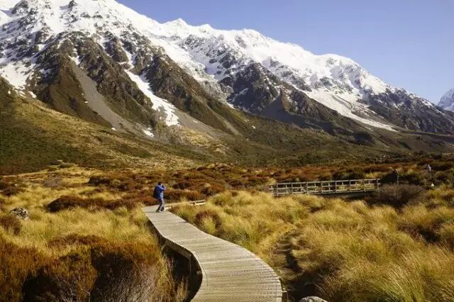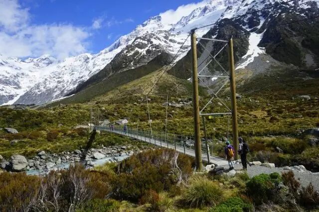 胡克谷步道 (Hooker Valley track):长九公里,来回约需3~4小时,是库克山国家公园最著名的步道。沿途除了有库克山峰和周围群峰美景相伴,春夏两季青翠的高山草地上,还有如库克山百合等无数美丽的花朵灿烂相迎。高山纪念碑 (Alpine memorial)是眺望山谷景色的绝佳据点,接近穆勒冰河(Mueller Glacier)时,还可欣赏高山与冰瀑的壮观景象。